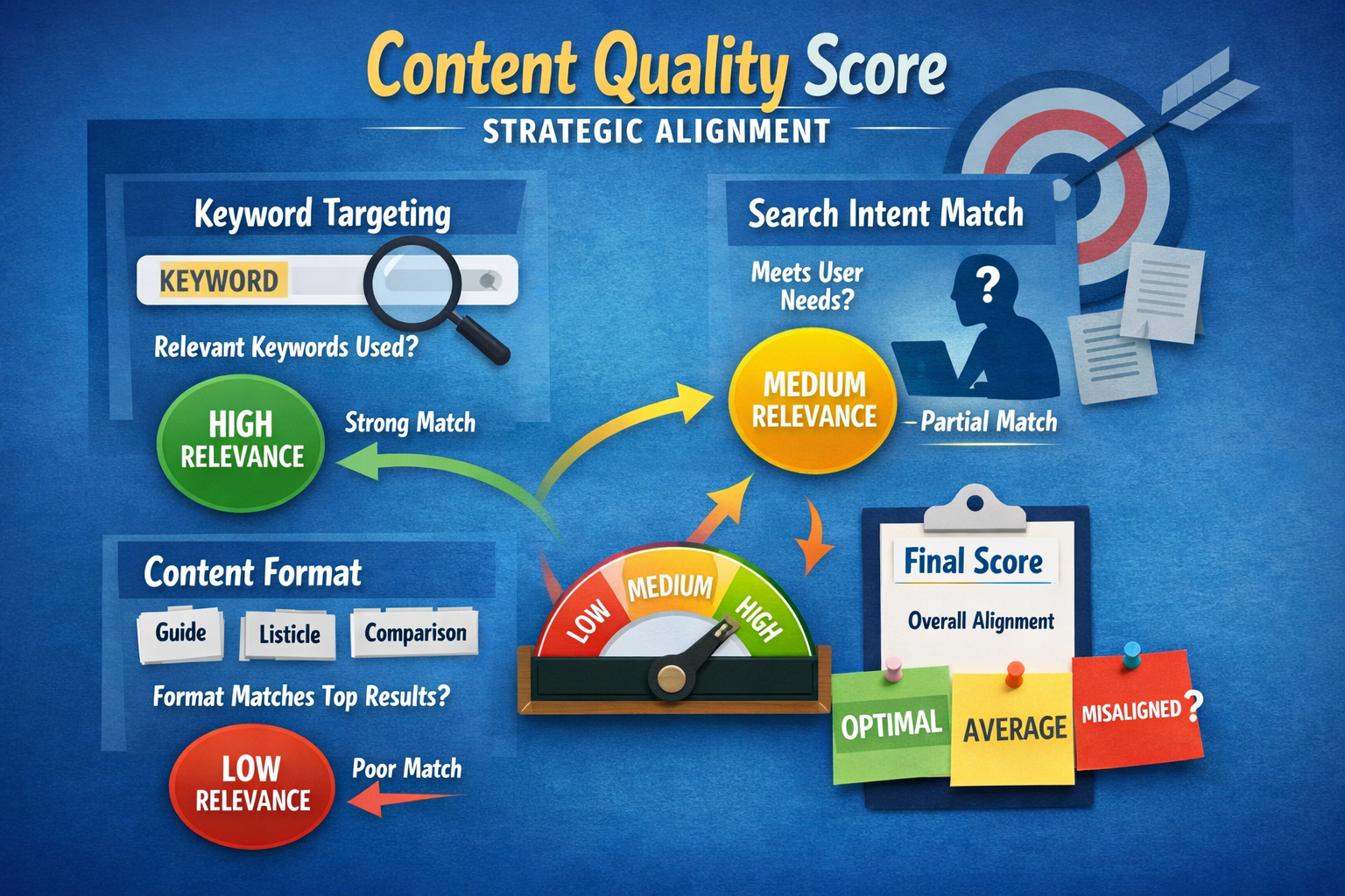| Search intent match | Content format matches what ranks for the target query (guide vs. listicle vs. comparison) | 0-5 |